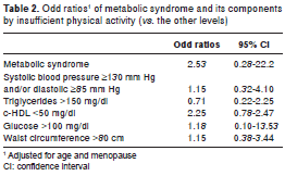 Table 2 describes the odds ratio (OR) for metabolic syndrome and its components after adjusting the insufficient physical activity level ( vs . the other levels together) by age and menopause. The women reporting the lowest level of physical activity presented a 2.53-fold increased risk of having MS, but the confidence interval was not significant. The OR between insufficient physical activity level and metabolic syndrome components was also not significant.