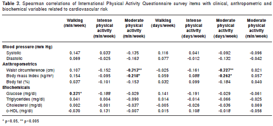 The IPAQ items related to moderate physical activity (time and days per week) and walking (time per week) were the only survey parameters significantly correlated with some variables related to cardiovascular risk. In the case of time and days of moderate physical activity , the correlations were exclusively with the anthropometric markers waist circumference and BMI, but in an inverse way. These inverse correlations are coherent with the premise of reduction in the recognized predictors of cardiovascular disease by regular practice of physical activity . However, time and days per week of vigorous intensity physical activity did not correlate with clinical, anthropometrical, and biochemical variables. In a prospective study, Wannamethee and Shaper described the association between moderate intensity physical activity and significant reduction in the risk of stroke and heart attacks in men both with and without pre-existing ischemic heart disease; however, vigorous activities were not associated (37). In contrast, Hu, et al ., reported a reduction in the risk of type 2 diabetes through both vigorous and moderate intensity physical activity (38). Moreover, the correlation between walking minutes per week and basal glucose levels was unexpectedly positive. However, in this correlation, age could be a confounding factor because this variable correlated positively with basal glucose levels ( r =0.334, p=0.001) and walking minutes per week ( r =0.231, p = 0.029). In this case, it is possible that older women tend to practice more walking and have higher glucose levels, or that this unexpected finding between fasting glucose and walking minutes per week could be a simple circumstantial and statistical relationship.