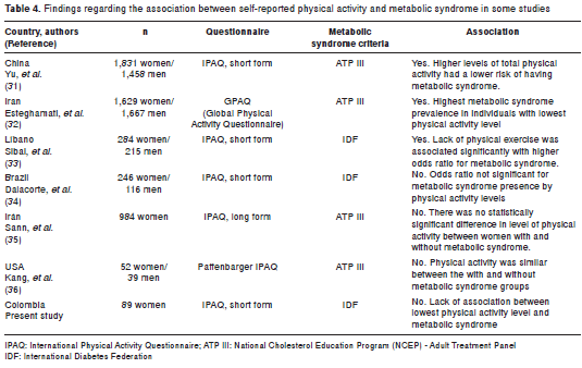 Although many studies have found a relationship between self-reported physical activity level and metabolic syndrome (31-33), others, such as the present study, have not observed any association (34-36) (table 4). Dalacorte, et al., attributed the lack of relationship to the long time required to establish a disorder such as metabolic syndrome and the possibility that numerous individuals with metabolic syndrome may have been sufficiently active and very active recently (33). Even a study with a bigger sample size than that of the study by Dalacorte, et al., did not find a relationship between self-reported physical activity level and metabolic syndrome (34). On the other hand, the women participating in the present study were apparently healthy, without clinical conditions such as hypertension or diabetes, which could represent a bias with respect to regular physical activity as a part of treatment in this situation.
