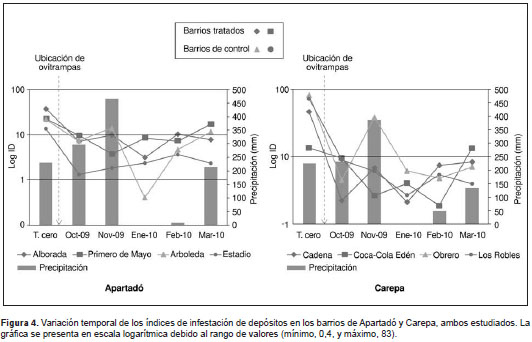 Materials and methods: We selected eight neighborhoods from the municipalities of Apartadó and Carepa. Two neighborhoods in each municipality were chosen for intervention and two for control. The intervention consisted in the installation of ovitraps with B. t. israeliensis in every house. The traps were visited each month between September, 2009, and March, 2010. Traditional indexes were obtained and compared among the neighborhoods. Ovitrap positivity index and egg density index were calculated and we generated density maps.