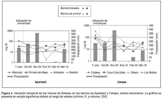 En el municipio de Apartadó, el barrio que presentó el valor más alto del índice de Breteau en el tiempo cero fue La Alborada (111,8), mientras que el barrio Arboleda presentó el más bajo (2,1) en el mes de enero. Después de colocar las ovitrampas se observó una reducción notable de este índice tanto en los barrios intervenidos como en los barrios de control (figura 5). Sin embargo, los valores del índice de Breteau en los barrios tratados siempre fueron superiores a los valores de los barrios de control. Se encontraron diferencias significativas entre el índice de Breteau del barrio La Alborada (intervenido) y el de los barrios de control (Friedman=7,0; p<0,05). En el municipio de Carepa, uno de los barrios de control, el barrio Obrero presentó el valor más alto para este índice en el tiempo cero (337,9), seguido por uno de los barrios intervenidos, el barrio Cadena, con un valor de 141,8; el valor más bajo (6,5) lo presentaron los barrios Coca-Cola Edén en octubre y Cadena en enero. Durante la intervención se logró una disminución importante en este índice, pero para marzo los barrios intervenidos presentaron valores superiores a los de los barrios de control.