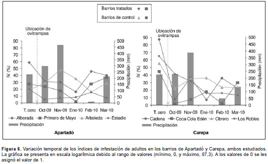 En el tiempo cero, el barrio del municipio de Apartadó que presentó el valor más alto del índice de adultos fue La Alborada (39,2 %), y en el municipio de Carepa, el barrio Cadena (87,3 %). Debe señalarse que este valor fue más alto en todos los barrios en el mes anterior a la intervención (tiempo cero) y que en algunos meses fue de cero, lo que indica que no había presencia de adultos en estos meses en las viviendas (figura 6).