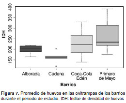 El índice de densidad de huevos más bajo se presentó en el barrio La Cadena, con un promedio de 170,9 huevos por ovitrampa, resultado que pudo haberse debido a la menor densidad de población humana en ese barrio y a sus condiciones semiurbanas, pues está localizado a mayor distancia de la cabecera municipal. Un resultado similar obtuvieron Regis, et al., (31) en Recife, Brasil, donde este índice fue más bajo en el barrio con menor densidad demográfica, ubicado en la periferia de la ciudad cerca de una zona boscosa.