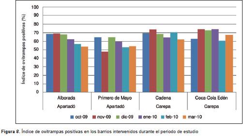 Materiales y métodos. Se seleccionaron ocho barrios de los municipios de Apartadó y Carepa, Antioquia, de los cuales se escogieron dos barrios para la intervención y dos para el control en cada municipio. La intervención consistió en la instalación de una ovitrampa con B. thuringiesis var. israeliensis en cada una de las viviendas. Las ovitrampas se visitaron mensualmente entre septiembre de 2009 y marzo de 2010. Se obtuvieron los índices aédicos tradicionales y se hicieron comparaciones entre los barrios. Se calculó el índice de ovitrampas positivas y el de densidad de huevos, y se generaron los mapas de densidad.