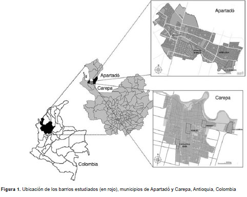 De los 11 municipios del Urabá antioqueño se seleccionaron los de Carepa y Apartadó, ya que allí se desarrolló el proyecto Abordaje ecosistémico para el control del dengue, del cual hizo parte este estudio. Estos municipios tienen condiciones climáticas y ecológicas propicias para el desarrollo del mosquito A. aegypti y en la región se registra anualmente un número importante de casos de dengue. En el 2010 se reportó en el municipio de Carepa una tasa de 134,3 casos de dengue por 100.000 habitantes, en tanto que en Apartadó la tasa fue de 28,7 casos de dengue por 100.000 habitantes (17).