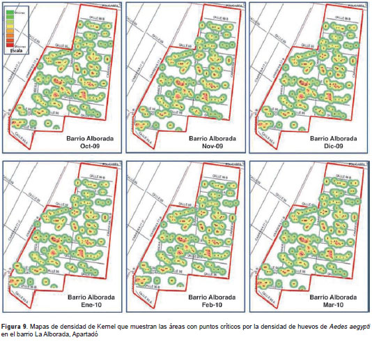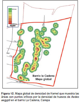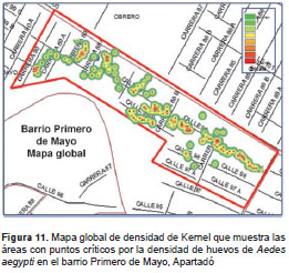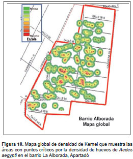 Uso de ovitrampas para la vigilancia de A. aegypti. Para evaluar las ovitrampas en la vigilancia de A. aegypti , se contaron los huevos de todas las telas retiradas de las ovitrampas. Con estos datos se calculó el índice de densidad de huevos. Los valores de dicho índice se utilizaron para determinar la distribución espacial de huevos de A. aegypti y obtener los puntos críticos de mayor densidad del vector, usando mapas de densidad de Kernel y el programa ArcGis 10,0.