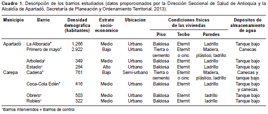Con base en los registros de las secretarías de salud de los municipios del estudio, se seleccionaron aleatoriamente ocho barrios de alta incidencia de infestación por A. aegypti (cuatro barrios por municipio) en las cabeceras municipales. En dos de los barrios seleccionados en cada municipio se efectuó la intervención y los otros dos se consideraron controles. La descripción de los barrios estudiados se presenta en el cuadro 1.