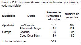 Conclusions: Ovitraps had an impact on traditional indexes and proved to be useful strategies for surveillance and control of A. aegypti in Urabá, Antioquia.