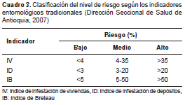 Teniendo en cuenta los hallazgos de estos autores, podemos decir que según los índices de ovitrampas positivas y de densidad de huevos hallados en este estudio, los barrios intervenidos presentaban un alto riesgo de infestación por A. aegypti , riesgo que no se pudo determinar con los índices tradicionales, como el de depósitos y el de Breteau.