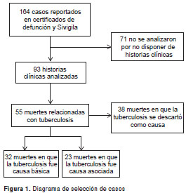 Resultados. El número de muertes fue de 93, de las cuales, 32 (34,4 %) se confirmaron como muertes directas por tuberculosis y 23 (24,7 %) como asociadas a esta enfermedad. En 34 (61,7 %) de los pacientes hubo alguna enfermedad concomitante, siendo el sida la más importante (18, 32,7 %). Se detectaron factores de riesgo social como ser habitante de la calle, farmacodependencia o carencia de domicilio fijo, en 32 casos (58,1 %), y aspectos que afectaron el proceso de atención de los servicios de salud, en 26 (47,2 %). Hubo un retraso de 40 días (rango intercuartílico: 19 a 84) entre el inicio de los síntomas y el diagnóstico. No se encontró retraso significativo en el inicio del tratamiento antituberculoso después del diagnóstico microbiológico; sin embargo, el porcentaje de incumplimiento del tratamiento fue de 64%.