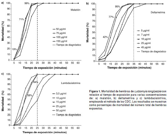 Resultados. En la cepa evaluada de L. longipalpis , las concentraciones y los tiempos diagnósticos fueron de 75 µg/ml y 25 minutos para el malatión, de 10 µg/ml y 35 minutos para la deltametrina y de 15 µg/ml y 30 minutos para la lambdacialotrina.