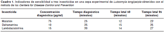 La obtención de la línea basal de los indica- dores de sensibilidad (concentraciones y tiempos diagnósticos) de L. longipalpis al malatión, la deltametrina y la lambdacialotrina, permitirá hacer comparaciones con poblaciones silvestres de esta especie sometidas regular o esporádicamente a control químico con estos insecticidas.