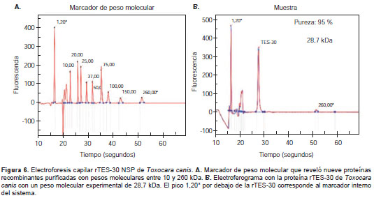Dada la naturaleza insoluble de la rTES-30 en este sistema, se procedió a aplicar un protocolo de purificación por cromatografía en condiciones desnaturalizantes, utilizando urea y columnas de afinidad con Ni-NTA. La elución de la proteína se hizo mediante cambios en el pH en diferentes pasos. Los resultados obtenidos de la separación electroforética de las diferentes fracciones de la cromatografía en geles SPS-PAGE teñidos con azul de Coomassie, mostraron una unión eficiente de la rTES-30 a la columna. Además, se observó una gran pureza de la proteína recombinante en estos mismos geles (figura 5). Los resultados de la cuantificación demostraron un rendimiento en la purificación de 2,25 mg de rTES-30 por litro de LB cosechado. Los análisis detallados de las fracciones purificadas de la rTES-30 mediante electroforesis capilar de proteínas, mostraron un grado de pureza de 95 % y una masa molecular relativa observada de 28,7 kDa (figura 6).