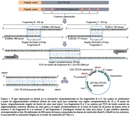 Una vez optimizada la región de codificación, se diseñó la estrategia para la síntesis y el ensamblaje del gen sintético que codifica para tes30 . Para ello, se diseñaron seis oligonucleótidos de ADN de cadena sencilla, a partir de los cuales se ensamblaría el gen sintético completo. Inicialmente, la secuencia optimizada se dividió mediante simulación computacional en los fragmentos principales N y C, para facilitar el diseño de los oligonucleótidos. Para la síntesis de cada frag mento, N o C, se sintetizaron dos oligonucleótidos correspondientes a las cadenas complementarias (Tc30Nfw-Tc30Nrv para el fragmento N y Tc30Cfw-Tc30Crv para el fragmento C), los cuales contenían una región de solapamiento y una complementaria de 18 y 19 pares de bases, respectivamente (región de alineamiento), que permitiría el alineamiento y síntesis por elongación con la Taq ADN polimerasa. Ambos fragmentos serían posteriormente fusiona dos mediante reacción en cadena de la polimerasa (PCR) con los oligonucleótidos externos TcfusNfw- Bam HI y TcfusCrv- Hind III.