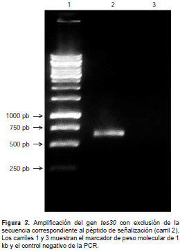 En la versión inicial, el gen se sintetizó y se clonó completo, incluidos los codones que codifican el péptido de señalización. Los péptidos de señalización en eucariotas pueden afectar negativamente la expresión heteróloga en E. coli , razón por la cual se hizo una PCR con el oligonucleótido interno TcfusN-NSP-fw- Bam HI y el ya descrito TcfusCrv- Hind III, para amplificar la versión del gen tes30, excluyendo la secuencia correspondiente al péptido de señalización (figura 3). El fragmento amplificado, de 633 pb sin el péptido de señalización, sésubclonó´ en el pET28a (pET28-rTES-30-NSP), el cual se utilizó en todas las etapas de este trabajo.