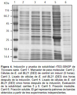 Para la expresión de la rTES-30 se utilizó la cepa bacteriana BL21 (DE3) y el vector pET28a. Este sistema permitió agregar dos colas de histidina a la proteína blanco para su posterior purificación en columnas de Ni 2+ inmovilizado, y para hacerla inducible con el análogo de la lactosa IPTG. La inducción de la rTES-30 a una temperatura de 37 °C y una concentración de inductor de 0,5 mM, expresó, a partir de la primera hora, una banda de aproximadamente 29,5 kDa, correspondiente a la masa molecular relativa esperada para la rTES-30. La acumulación de la proteína recombinante continuó durante las siguientes horas del experimento y a las cinco horas se observó una acumulación aceptable para la recolección (figura 4). Los análisis posteriores de la solubilidad de la rTES-30 mostraron que la proteína se encontraba toda en el sedimento, lo que indicaba su acumulación insoluble en cuerpos de inclusión (figura 4).