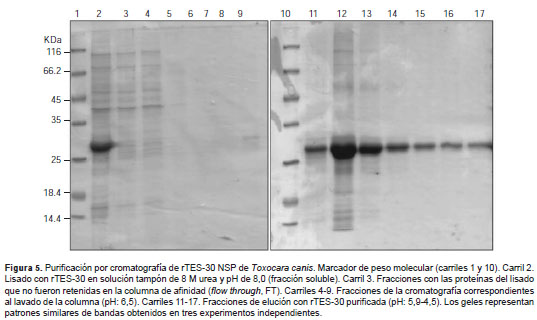 Igualmente, se logró desarrollar un protocolo de purificación eficiente para dicha proteína recombinante. El protocolo de purificación por afinidad de tipo IMAC aplicado en este estudio, permitió la purificación eficiente de la proteína recombinante antigénica rTES-30. Para la elución de las proteínas retenidas en las columnas de afinidad, se puede utilizar un competidor de la interacción con el metal, el cual puede ser histidina o imidazol, o un cambio en el pH de la solución tampón de cromatografía. En este caso, se lograron buenos resultados haciendo uso del cambio de pH en las soluciones tampón, ya que la proteína se eluye eficientemente al bajar el pH de la solución tampón a 4,5.