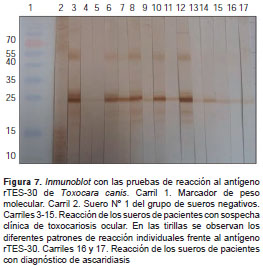 Una vez obtenida la proteína recombinante rTES-30 de T. canis , se procedió a hacer los ensayos de immunoblot . La observación de una banda de alrededor de 25 kDa en las membranas de nitrocelulosa, confirmó la reacción de los sueros ensayados frente al antígeno rTES-30 (figura 7). En esta figura se observaron en la membrana unas bandas adicionales que podrían corresponder a proteínas contamina ntes de E. coli purificadas de manera simultánea en la cromatografía, o a fragmentos truncados de rTES-30. Alrededor de los 55 kDa se observó, igualmente, la reacción de los sueros, la cual podría corresponder a otra proteína contaminante o a dímeros de la rTES-30 no desnaturalizados apropiadamente. No se observó reacción en el suero del paciente que hacía parte del grupo de controles negativos. Se observaron diferentes patrones de reacción en cada uno de los sueros de los pacientes con sospecha clínica de toxocariasis ocular evaluados, así como en aquellos con diagnóstico parasitológico de ascariasis. En el caso de esta última parasitosis, no se pudo establecer con certeza que se tratara de una reacción cruzada, debido a que el estudio se llevó a cabo en una zona endémica de varios parasitismos.