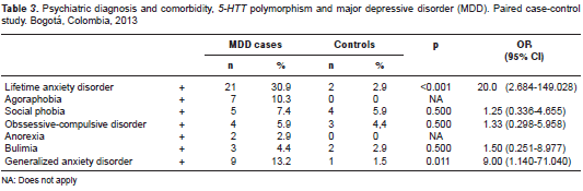 It is also necessary to evaluate the triallelic model of the 5-HTT gene and the influence of polymorphisms of other genes involved in the susceptibility to major depressive disorder. Financial limitations prevented further assessment of other variants in 5-HTT gene, as well as the study of a larger sample of cases and controls. Subsequent studies are needed with larger samples that are representative of people with major depression in Bogotá and other regions of the country.