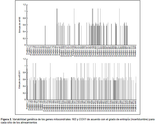 Los electroforegramas obtenidos para los genes 16S y COX1 se editaron manualmente con el programa Chromas Lite; se obtuvieron las secuencias de consenso por muestra y se alinearon utilizando el algoritmo de Clustal W, con lo cual se generó un alineamiento múltiple de 328 sitios para las secuencias del gen 16S y de 690 sitios para las del gen COX1 . Una vez obtenido el alineamiento, se procedió a estimar el mejor modelo de sustitución de nucleótidos mediante el JModelTest y con el criterio de información Akaike corregido (AICc) (29). Los árboles filogenéticos se analizaron con el algoritmo de máxima verosimilitud de 1.000 repeticiones con el método de bootstrap y el mejor modelo de sustitución de nucleótidos calculado previamente con el programa MEGA 5.2 (30). Además, se valoró el grado de saturación de las sustituciones de los marcadores genéticos mediante un gráfico de saturación con transiciones (s) y transversiones (v), así como la distribución de los sitios variables y el grado de variabilidad genética por sitio a lo largo de las matrices de secuencias de ambos genes mediante un análisis de entropía en el programa DAMBE 5 (31).