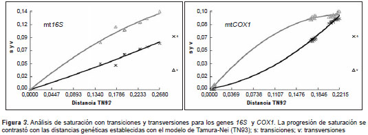 Las distancias promedio totales fueron mayores cuando se utilizó el marcador COX1 (13,91 %) en comparación con el marcador 16S (11,89 %). Por otro lado, el rango de distancia interespecífica, calculado como la diferencia porcentual entre la distancia máxima (dMax) y la distancia mínima (dMin) de todas las secuencias de cada marcador mitocondrial, indicó que el gen 16S proveía un mayor rango de distancias, con 5,1 %, mientras que el COX1 fue similar aunque inferior, con 5,04 %. Con respecto al análisis de saturación (figura 3), a diferencia del gen COX1 , el cual presentó saturación con transversiones a partir de distancias Tamura-Nei de ˜17 %, el marcador 16S no se saturó con sustituciones. Sin embargo, la remoción de la tercera posición del codón en el análisis de saturación del gen COX1 permitió superar este inconveniente, aunque la variabilidad máxima observada con las dos primeras posiciones del codón fue de hasta 6,24 % (no se presentan los datos).