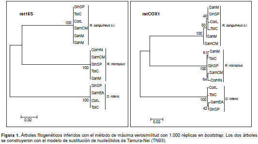En los árboles filogenéticos se observó que, como era de esperarse, ambos marcadores genéticos eran capaces de diferenciar con gran confiabilidad las tres especies de garrapatas (figura 1), aunque las distancias interespecíficas medias según el modelo de Tamura-Nei con el COX1 siempre fueron mayores a las del gen mitocondrial 16S (cuadro 1).