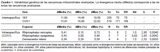 En la presente evaluación de los marcadores genéticos mitocondriales 16S y COX1 , el gen 16S fue especialmente útil para la separación de especies debido a su baja variabilidad genética intraespecífica, lo cual facilita la asignación de especies y da un rango de distancia interespecífica ligeramente mayor, por lo que se sugiere que este marcador sea utilizado en los estudios sobre relaciones interespecíficas. Por otro lado, aunque el marcador COX1 también permite diferenciar con gran confiabilidad las tres especies de garrapatas analizadas, fue evidente que es más útil para detectar una variabilidad genética intraespecífica de hasta 0,88 % en muestras que no presentaron variabilidad genética con el gen 16S .