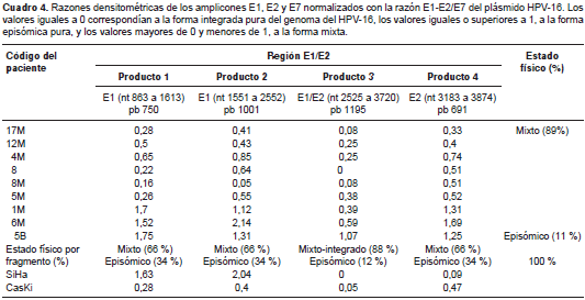 Se determinó el estado físico del HPV-16 mediante PCR múltiple con dos reacciones para amplificar la región completa de los genes E1 y E2 . En la primera reacción se amplificaron los fragmentos 1 y 3, y en la segunda, los fragmentos 2 y 4; también se amplificó la región E7 como control en las dos reacciones. En el cuadro 4 se muestran las razones densitométricas halladas para cada fragmento.