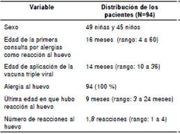 De los 123 pacientes con sospecha de reacción al huevo que asistieron a consulta en los centros de estudio, se excluyeron cuatro porque no cumplían con la edad fijada y 25 con resultados negativos en las pruebas con huevo. Se seleccionaron, finalmente, 94 pacientes con hipersensibilidad mediada por IgE demostrada en las pruebas, cuyos datos generales se presentan en el cuadro 1.