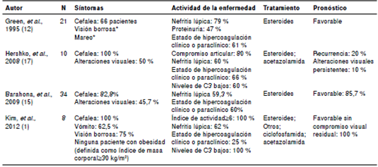 En 1968, Bettman, et al.16, fueron los primeros en reportar un paciente con lupus eritematoso sistémico y seudotumor. Desde entonces, en varios estudios se ha descrito la asociación entre una y otra condición en población adulta (Cuadro 2). Sin embargo, no se encontraron reportes de seudotumor cerebral como manifestación neuro-psiquiátrica del lupus durante el embarazo.