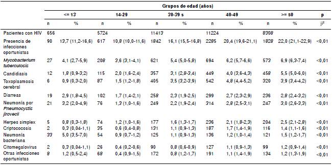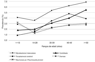 La prevalencia de las infecciones oportunistas siguió un patrón ascendente a medida que se incrementaba la edad. Entre los niños menores de 13 años,su prevalencia fue de 13,7 % (90/656). Las más frecuentes en este grupo de edad fueron la neumonía bacteriana, con una prevalencia de 5,0 %, la tuberculosis (4,1 %) y la neumonía por Pneumocystis jirovecii (3,2 %). En el resto de los grupos de edad, las infecciones más prevalentes fueron la tuberculosis (rango: 3,6-6,9 %), la candidiasis (rango: 2,0-5,5 %) y la toxoplasmosis cerebral (rango: 1,5-4,8 %), con leves variaciones entre los grupos. Las diarreas ocuparon el tercer lugar en la población entre14 y 29 años de edad, con una prevalencia de 1,7 %. En la población mayor de 40 años, la prevalencia de infecciones oportunistas fue superior al 20 % (cuadro 3, figura 1).