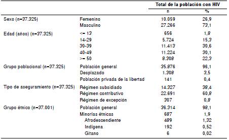 En la Cuenta de Alto Costo se registraron 37.325 pacientes con HIV asegurados durante el período de estudio, de los cuales el 73,1% eran hombres. La media de edad fue de 40 años, con un rango entre 1 y 93 años. Con relación al origen étnico, solo el 2,0 % pertenecía a minorías étnicas y el 3,9 % pertenecía a grupos poblacionales vulnerables (desplazados o privados de la libertad). El 60,8 % estaba afiliado al régimen contributivo de salud.