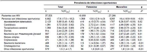 La prevalencia de infecciones oportunistas en hombres fue de 19,4% (IC95% 18,9-19,9) y en las mujeres fue de 13,6 % (IC95% 13,6-14,3). Se observó una prevalencia mayor en los hombres, con una diferencia estadísticamente significativa.
