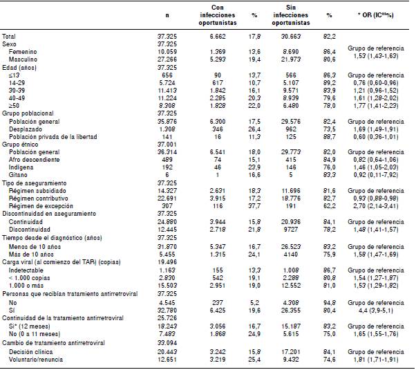 Los datos disponibles mostraron que el 17,8 % de la población estudiada sufría, por lo menos, de una de las infecciones oportunistas analizadas, siendo común la presencia de dos o más de ellas. La prevalencia fue significativamente mayor en hombres, en mayores de 40 años, en población desplazada, en población indígena, en personas afiliadas al régimen subsidiado o de excepción, así como en aquellos que tuvieron discontinuidad en el aseguramiento o en el tratamiento antirretroviral.
