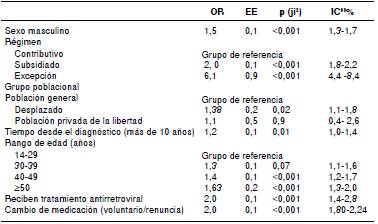 Según el modelo multivariado, los factores asociados con la presencia de infecciones oportunistas en los pacientes adultos con enfermedad en estadio A en el momento del diagnóstico de HIV, fueron el sexo masculino (OR=1,51; IC95% 1,3-1,7), el régimen de seguridad social al cual estaban afiliados, siendo mayor el riesgo para la población en regímenes de excepción (OR=6,1; IC95% 4,4-8,4), el desplazamiento (OR=1,4; IC95% 1,1-1,8), y un tiempo mayor de diez años desde el momento del diagnóstico (OR=1,2; IC95%1,0-1,4). También, se observó un aumento del riesgo a medida que aumentaba la edad, así como en los pacientes que recibieron el tratamiento antirretroviral (OR=2,0; IC95% 1,4-2,8) y en aquellos que cambiaron el esquema de medicación por voluntad propia (OR=2,0; IC95% 1,8-2,2) (cuadro 5).