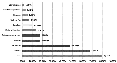 El 46,8 % de las pacientes ingresó al servicio de urgencias, el 37,8 % fue remitido para hospitalización y el 15,3 % correspondió a hospitalizadas en el momento del diagnóstico. El promedio de evolución de la enfermedad actual fue de 4,3 días (DE=4,5). Los síntomas más frecuentes desde el inicio de la enfermedad fueron la fiebre (79,3 %) y la cefalea (67,6 %); la tríada de fiebre, cefalea y escalofríos se presentó en el 41% de casos. Estos y otros síntomas referidos desde el inicio de la enfermedad se presentan en la figura 1.