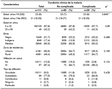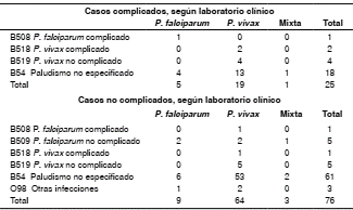 Cuando se sumaron los criterios de lesión moderada y grave 16, consideradas como complicaciones, los casos ascendieron a 26 (23,4 %). De estos, 19 (73,1 %) fueron infecciones causadas por P. vivax, 6 (23,1 %), por P. falciparum y 1 (3,8 %) fue una infección mixta por estas especies. Se diagnosticaron complicaciones en 19 (22,3 %) de 85 casos de P. vivax, en 6 (37,5 %) de 16 casos de P. falciparum y en 1 (25 %) de 4 casos mixtos, sin que ello represente una diferencia estadísticamente significativa.