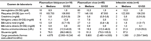 Cuadro 5 Complicaciones diagnosticadas y valores de laboratorio según el estado de gravedad en 111 mujeres gestantes con malaria en Antioquia