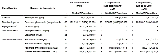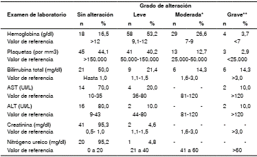 En el cuadro 3 se presentan los resultados de los exámenes de laboratorio usados para clasificar las complicaciones clínicas y en el cuadro 4, los valores de referencia para la clasificación del estado de gravedad.