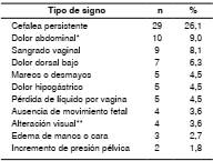 Se presentaron signos clínicos considerados de peligro para la gestación en 45 (40,5 %) pacientes; la cefalea persistente fue el más frecuente, seguido del dolor abdominal y el sangrado vaginal (cuadro 6). La presencia de por lo menos uno de estos signos se relacionó con mayores probabilidades de presentar una complicación clínica (OR=1,4; IC: 1,1-1,8; ji al cuadrado, p<0,003). Se reconoció la sintomatología indicativa de preeclampsia en 6 (5,4 %) de las pacientes, una de las cuales presentó disfunción hepática y trombocitopenia graves.