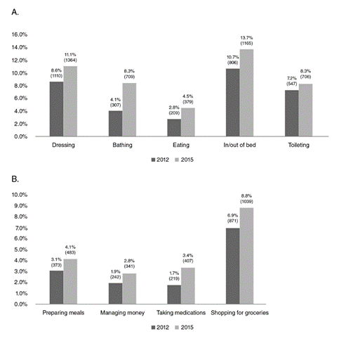 The cohort baseline details are provided in table 1. The prevalence of functional limitation by activity is detailed in figure 2. The mean age of the sample was 63.88 ± 9.21 years and the majority of subjects were female (56.01%). Figure 2 shows the transition of ADL and IADL limitations between 2012 and 2015: getting in/out of bed (ADL) had the highest incidence (3%) while taking medications was the IADL with the highest incidence (1.7%).