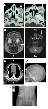 Figura 1 A. Tomografia inicial con contraste de órbita simple: se observa una lesión isodensa encapsulada en la región infraorbitaria izquierda que muestra cápsula que capta el medio de contraste. El centro de la lesión es el cuerpo del hueso malar izquierdo que está erosionado y remodelado por la lesión. La lesión erosiona el arco cigomático izquierdo, se extiende a la órbita izquierda y rechaza el globo ocular en sentido central y superior. Sus diámetros son: cefalo-caudal de 2,3 cm, antero-posteriorde 2,2 cm y transverso de 2 cm. B. Resonancia magnética con contraste de cara y cráneo: se aprecia una lesión tumoral en las regiones infraorbitaria y maxilar izquierdas, con compromiso de tejidos blandos e infiltración ósea de maxilar, arco cigomático y piso orbitario, y con extensión infraorbitaria y al espacio masticatorio; se observa una lesión que compromete la tabla ósea frontal derecha. C. Tomografia computarizada simple de tórax: nodulos pulmonares en la periferia del pulmón derecho. D. Radiografía simple de cráneo: lesión lítica de bordes esclerosos y 23 x 15 mm en el hueso frontal derecho. E. Radiografía de pelvis: lesión lítica de bordes esclerosos en de la porción inferior del ilíaco derecho, adyacente a la articulación sacroilíaca, de aproximadamente 25 x 15 mm.