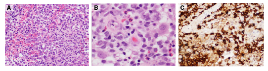 Figura 2 En los cortes se observan fragmentos de tejido infiltrado por una proliferación de células elongadas con hendiduras nucleares. En el fondo encuentran células gigantes multinucleadas y un menor número de eosinófilos. A. Hematoxilina-eosina, 40X. B. Hematoxilina-eosina, 100 X. C. CD1a