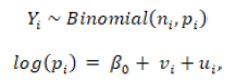 where n i is the denominator in each municipality and the rate in each municipality, i, is represented by p i The model has two random effects that represent non-spatial and spatial variability, v i v i , and u i u i . These effects allow for the estimation of the smoothed rate for each municipality with the equation: exp(β0 +v i +u i ). The a priori distributions of spatial effects was assigned through an intrinsic conditional autoregressive (ICAR) distribution with variance σ 2 while for the non-spatial effects we used a normal distribution with zero as mean and variance σ v 2 (19. A half-normal distribution with a mean of 0 and a precision of 0.0001 was assigned to the standard deviations σ v and σ u 20. For parameter ∝∝, we assigned a normal “vague prior” distribution.