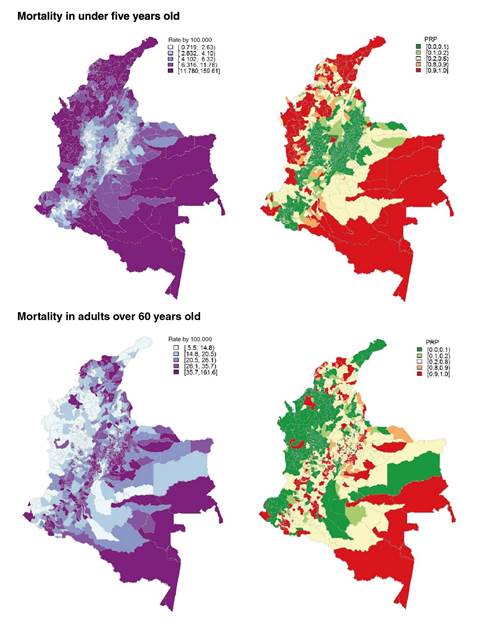 The model estimated the smoothed mortality rate (SMR) with the corresponding 95% confidence interval for each municipality, as well as the a posteriori probability (PrP), which indicates whether each municipality had a smoothed rate significantly higher than the rate of Colombia (p<0.05). This was calculated as PrP i = Probability (smothed P i > rate in Colombia)The model was estimated by using the integrated nested Laplace approximation (INLA) method available in the statistical package R.2.15.3 INLA library 21,22.