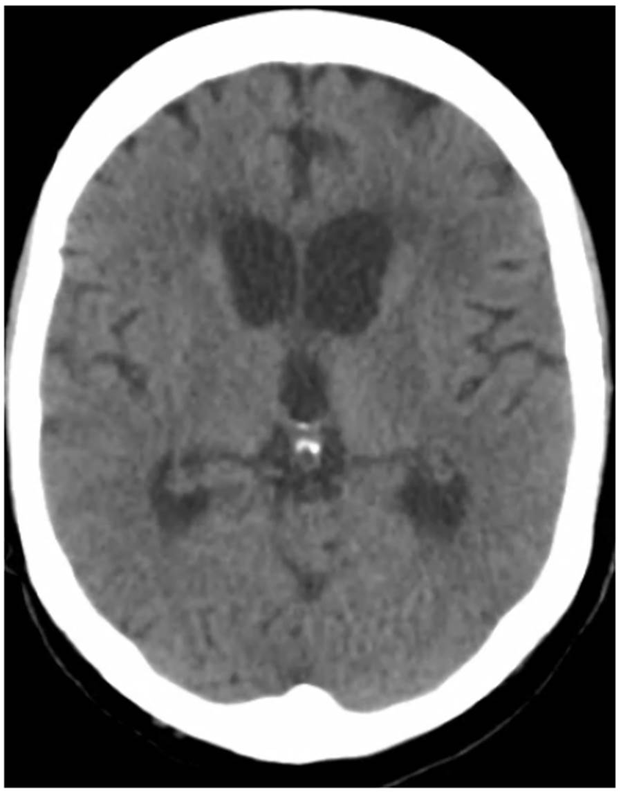 Figura 1 Tomografía de cráneo que muestra aumento de tamaño de los ventrículos laterales y el tercer ventrículo, indicativo de hidrocefalia no comunicante