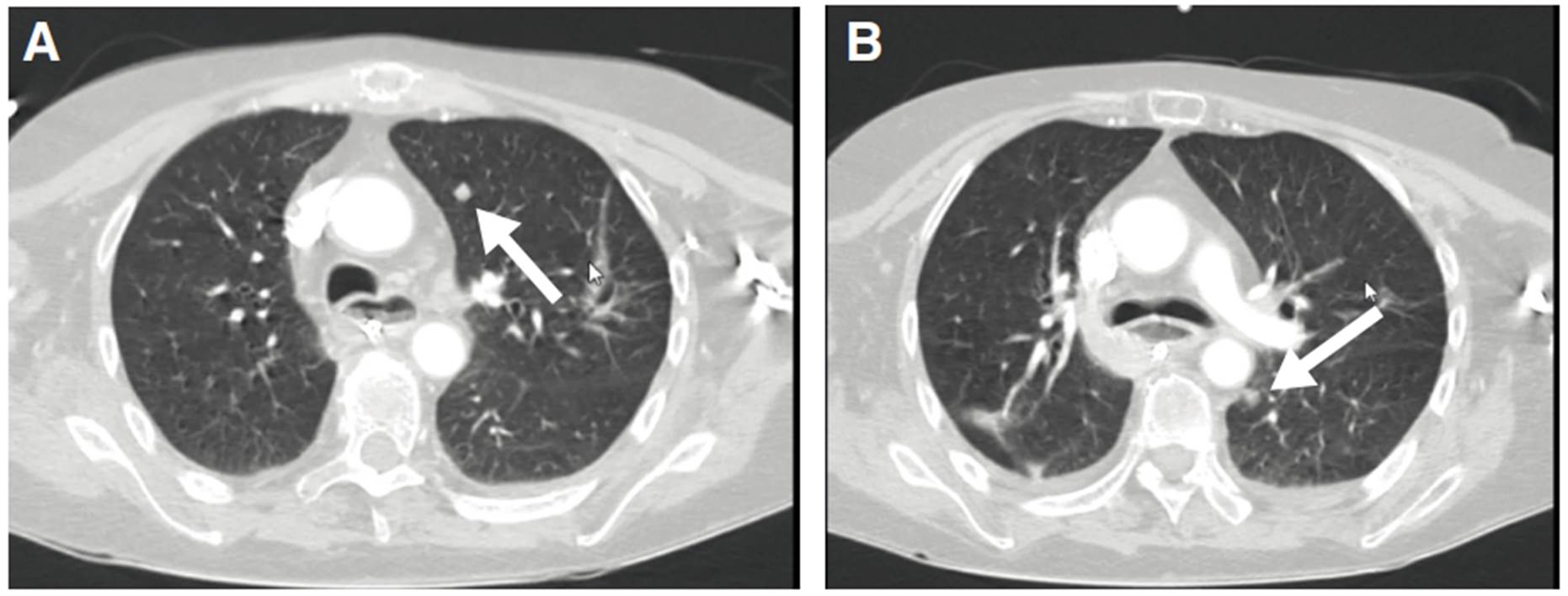 Figura 2 A. Nódulo con densidad de tejidos blandos en el lóbulo superior del pulmón izquierdo. B. Nódulo con densidad de tejidos blandos en el lóbulo inferior del pulmón izquierdo