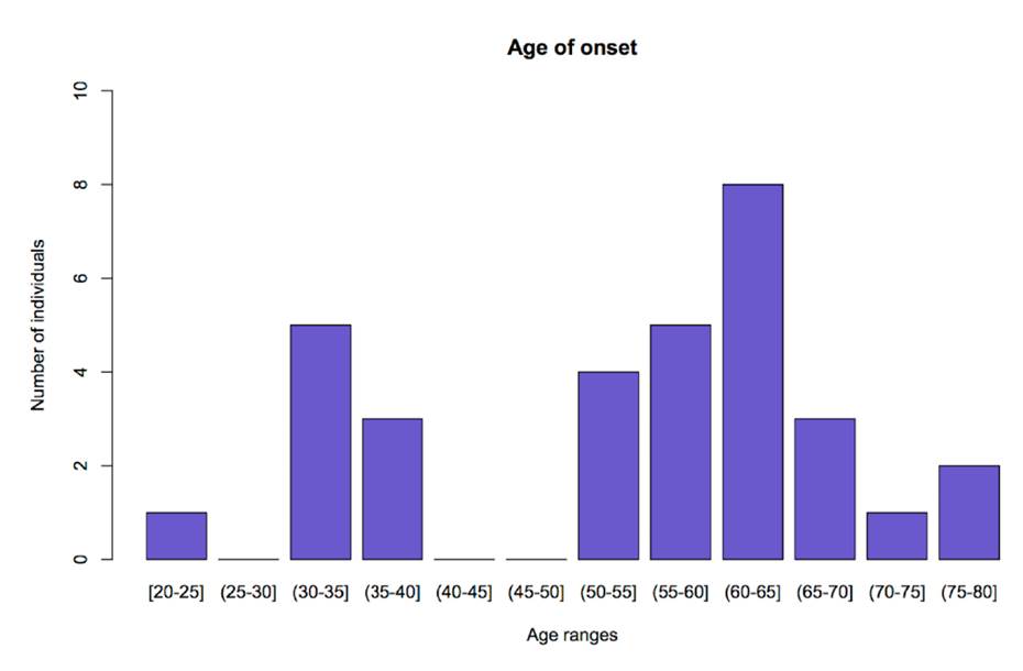 Figure 1 Age of onset and number of patients. The graph shows the distribution of patients according to the age at onset of ALS, presented as age ranges. The y-axis represents the number of patients and the x-axis represents age ranges. Figure done using R version 3.3.2 (R Project for Statistical Computing, RRID:SCR_001905).