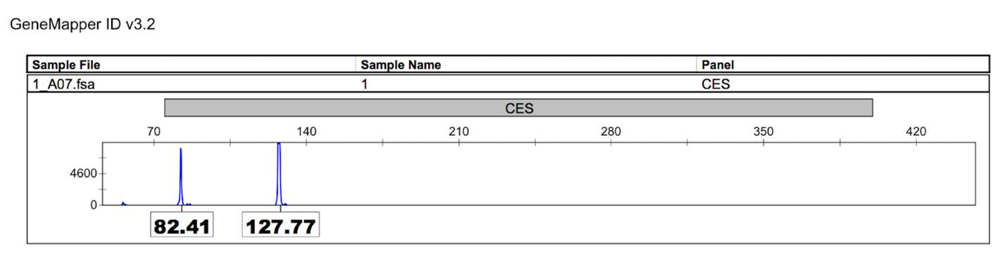 Figure 2 C9orf72 alleles. Capillary electrophoresis results, using an ABI PRISM genetic analyzer. Alleles are represented in the x-axis with relative fluorescence units (RFUs) shown in the y-axis. Alleles are identified with number of base pairs: Allele 1 (82. 41pb); Allele 2 (127.77pb).