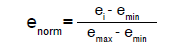 En donde: (enorm) es la edad normalizada, (ei) es la edad del individuo, (emin) es la edad mínima y (emax) es la edad máxima.